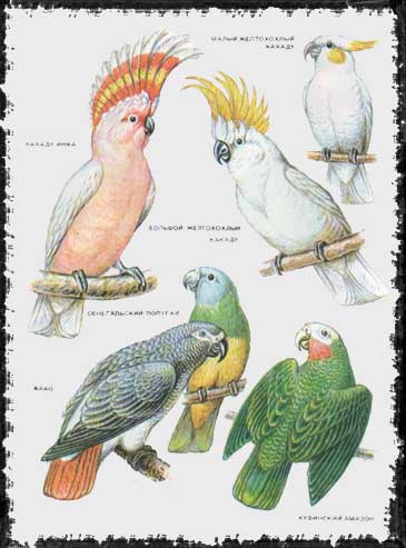 Попугаи популярее канереек. Ни в одном другом отряде пернатых нет такого разнообразия в расцветке оперения, как в отряде попугаеобразных. Чаще других в окраске попугаев присутствует зеленый цвет, нередко в сочетании с желтым и синим. Черный и серый цвета встречаются реже. От большинства других птиц попугаи отличаются толстым, коротким клювом, крючковатой формы. Попугаи способны раскалывать очень твердые орехи и одновременно могут снимать с сочных плодов их тонкую кожицу. При лазании по деревьям попугаи хватаются клювом за ветви. Некоторые виды попугаев иногда ради развлечения повисают, зацепившись за сетчатый потолок клетки клювом. Неспроста попугаев называют «обезьянами среди птиц». У попугаев короткие лапы, но они отлично развиты. Когти на лапах прекрасно приспособлены к лазанию. Самый распространенный, самый любимый и самый известный попугай – волнистый. Во всем мире люди держат волнистого попугая у себя дома. Домашние попугаи имеют самую разнообразную окраску оперения - традиционную: зеленую и желтую, а также синюю, серую белую. Нельзя ни в коем случае держать волнистых попугайчиков поодиночке. Им нужна близость представителей своего вида. На их родине в Австралии попугайчики никогда не живут порознь. Стайками летают они среди деревьев, в самые жаркие часы попугаи прячутся от солнца в кронах деревьев. Утром и вечером, когда не так жарко, попугаи слетаются к воде, чтобы напиться. Когда наступает пора размножения, попугаи прекращают перелеты внутри леса. Обычно самки откладывают яйца после периода дождей, когда растительность в лесу становится пышной. Родителям в это время не составляет особого труда найти корм для себя и прокормить малышей.