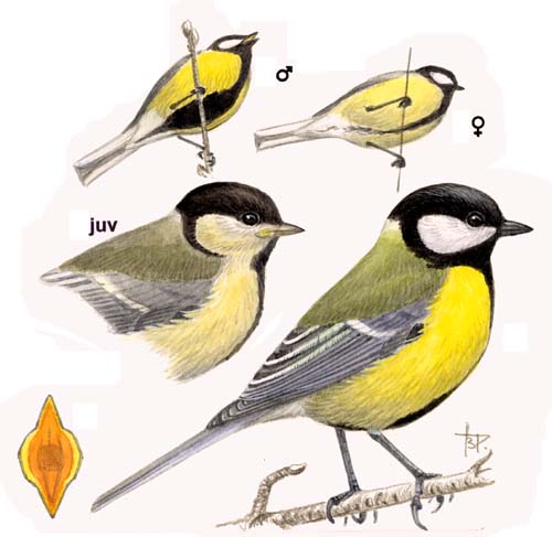 Род синиц насчитывает 12 видов — большая, лазоревка, длиннохвостая, ремез и др. Это ловкие, подвижные, смышленые птицы. На воле они устраивают свое закрытое гнездо в дуплах деревьев и других укрытиях. В домашних условиях хорошо приживаются, не требуют особого ухода. Синица большая имеет массу около 20 г. У нее красочное оперение — спинка желтовато-зеленая, грудь и брюшко — желтые с черной полоской вроде галстука. Верх головы, боковые части или зоб черные со стальным синеватым отливом. По обеим сторонам головы — белые пятна, крылья серо-голубые, хвост черноватый с голубизной.