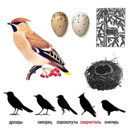 Эти птицы появляются у нас в конце осени — начале зимы вместе со снегирями, словно последние мазки на фоне увядающей природы. В их оперении преобладает серовато-бурый фон с розовым оттенком, на котором выделяются черные с красными роговыми чешуйками и белыми концами маховые перья. Серый у основания хвост переходит в черно-желтую поперечную полосу, горло черное. На голове буровато-коричневый хохолок.