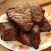 Стейк – это большой толстый кусок среднепрожаренного сочного мяса, покрытый сверху румяной поджаристой корочкой и выделяющий сок, если нажать на него вилкой.