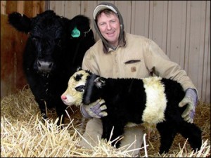 Уже седьмой год селекционер Джон Бартелд из Вашингтона разводит на своей частной ферме миниатюрных коров , он приложил много усилий чтобы получить новый вид корову –панду. И наконец может предоставить миру телёнка с такой удивительной раскраской, который похож на редкого медведя. Это Арахис с белой мордочкой и двумя тёмными пятнами вокруг глаз, и чёрное туловище с большой белой полосой .Бычок очень особенный и даже ведёт себя как звезда, очень нахальный и чувствует себя лидером среди более старших телят, хотя и слишком привязан к матери .