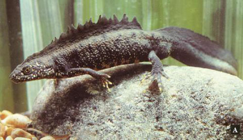 Отряд хвостатых в классе земноводных насчитывает около 280 видов. У нас встречаются тритоны обыкновенные и гребенчатые. Обыкновенный тритон - самый мелкий среди земноводных. Длина его — от 8 до 11 см, половина из которой приходится на хвост. Спинка у самца и самки оливково-бурого цвета, а брюшко желтоватое с темными пятнами, на голове продольные темные полосы. В брачный период у самца от затылка до конца хвоста вырастает гребень с оранжевой каймой и голубой полосой с перламутровым отливом.